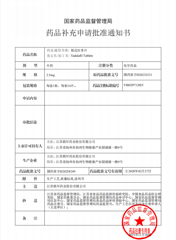 近期,从国家药品监督管理局传来喜讯,深圳永利时代他达拉非片(2.5mg、5mg)取得药品补充申请批件。随着2.5mg和5mg规格的获批,公司在不到3年时间内成功完成他达拉非片所有主流规格(2.5mg、5mg、10mg、20mg)的上市布局。